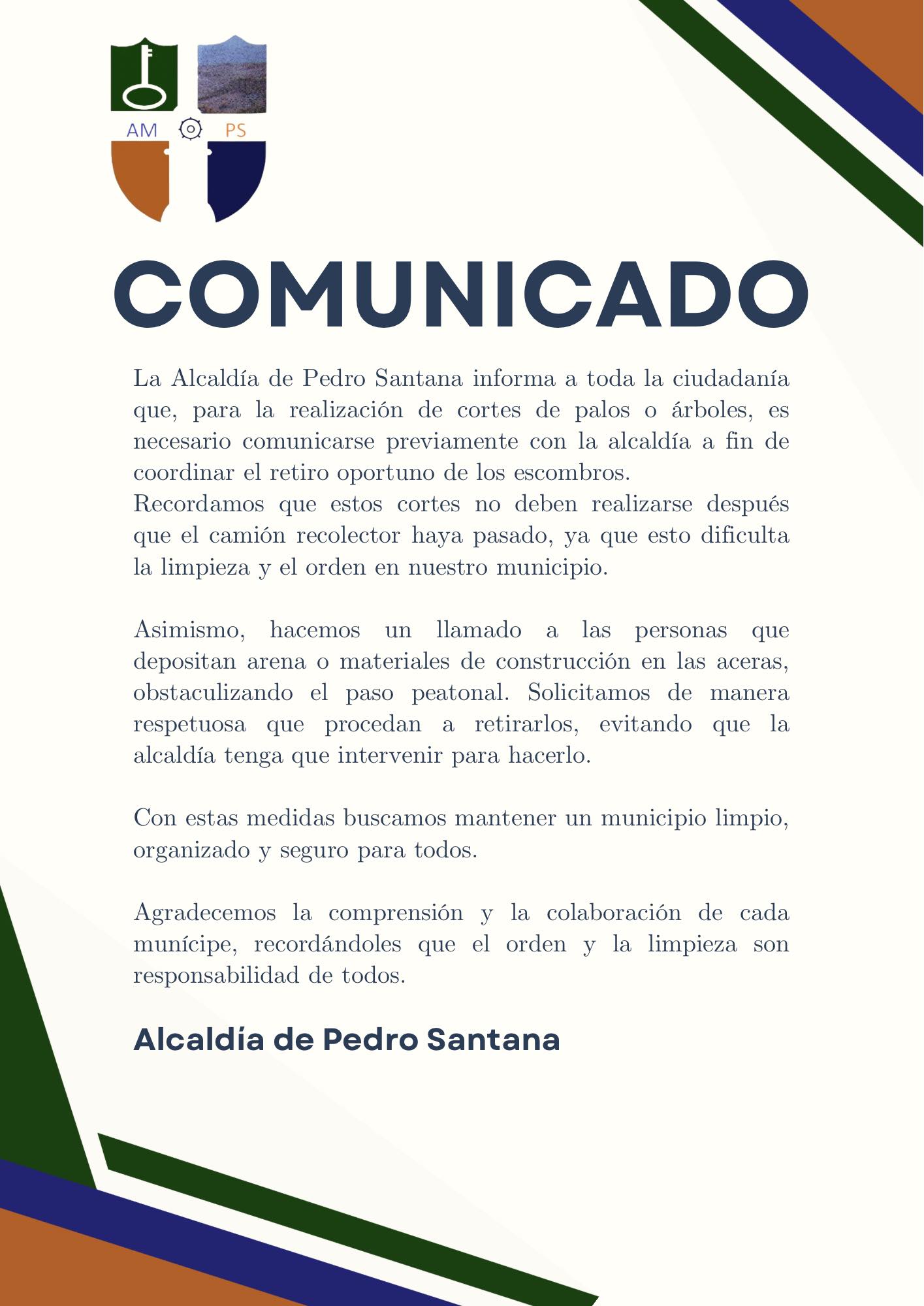 La Alcaldía de Pedro Santana informa a toda la ciudadanía que, para la realización de cortes de palos o árboles, es necesario comunicarse previamente con la alcaldía a fin de coordinar el retiro oportuno de los escombros.