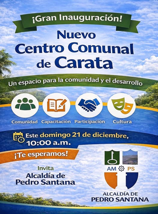 La Alcaldía de Pedro Santana invita a toda la comunidad a la inauguración del Nuevo Centro Comunal de Carata, un espacio creado para fortalecer la participación, la capacitación y el desarrollo comunitario.