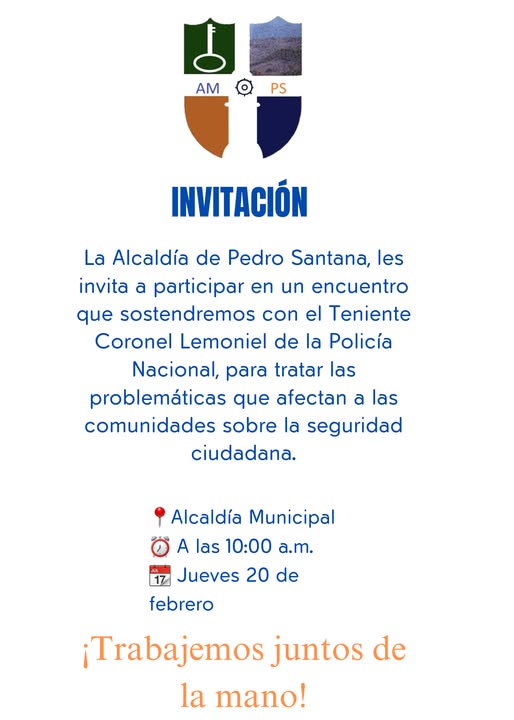 La Alcaldía de Pedro Santana, les invita a participar en un encuentro que sostendremos con el Teniente Coronel Lemoniel de la Policía Nacional, para tratar las problemáticas que afectan a las comunidades sobre la seguridad ciudadana.