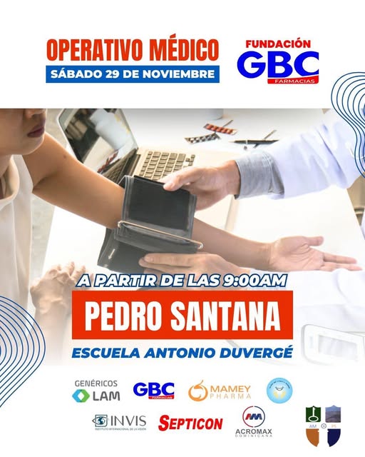 Este sábado 29 de noviembre, desde las 9:00 a.m., estaremos realizando un amplio operativo médico completamente gratuito en la Escuela Antonio Duvergé.