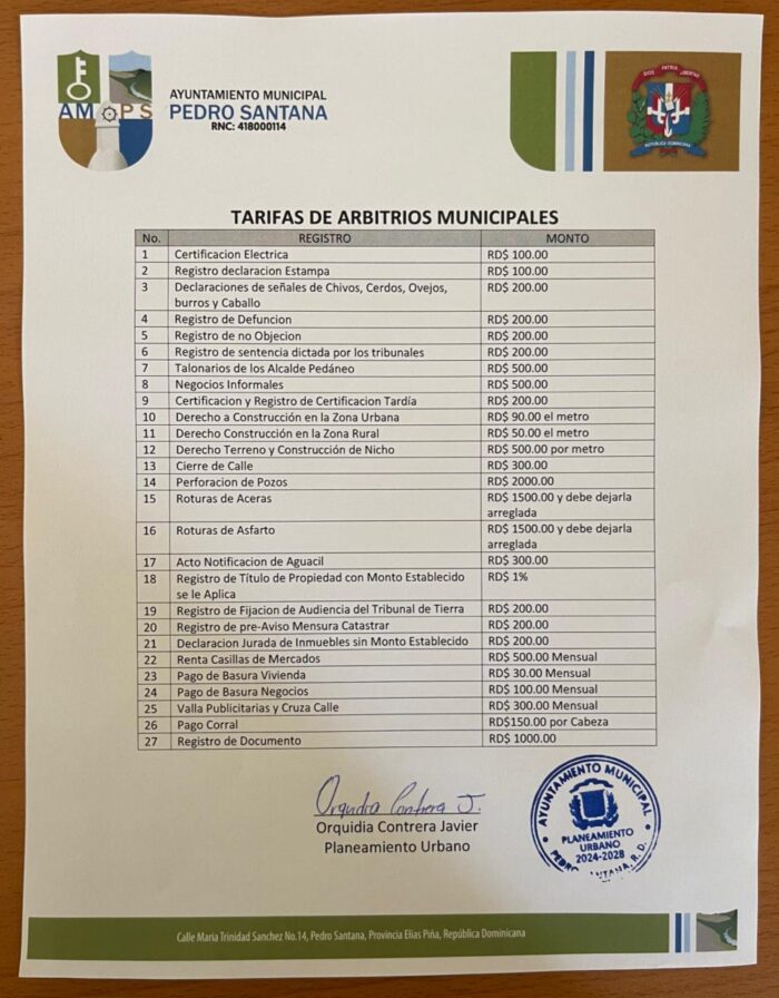 - Carta de solicitud dirigida a el Encargado de Planeamiento Urbano solicitando el permiso para la colocación de Letreros, Vallas, Tarima, Carpa y otros, especificando dimensión (tamaño), fecha de instalación y duración de la misma (tiempo de colocación) y números de contacto.